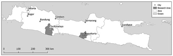 The research was mainly carried out within two regions of Java: in Tasikmalaya District in West Java Province and in the three districts Sleman, Bantul and Kulon Progo in Yogyakarta Province (see Figure 1). We selected these regions based on the capacity of our field partner AOI, who has a large number of actively engaged members in these two regions and could therefore implement organic farming training for 300 farmers in each region. Moreover, both regions share the characteristics of being important organic agricultural production areas, particularly for rice. Farmer groups in Tasikmalaya have succeeded in exporting organic rice [62], while the Yogyakarta region produces organic rice, vegetables, snake fruit and brown coconut sugar [63,64]. The research sites jointly have a population of 5.4 million inhabitants.