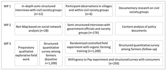 The work package ‘Values’ (WP 1) explored the values and belief systems related to organic farming, focusing on the role of trade and potential markets for organic products. The work package ‘Institutions’ (WP2) focused on formal institutions and their roles in the policy arena of organic agriculture. The work package ‘Adoption’ (WP3) focused on farmers and consumers. The specific sub-questions that were addressed by each WP are summarised in Table 1.