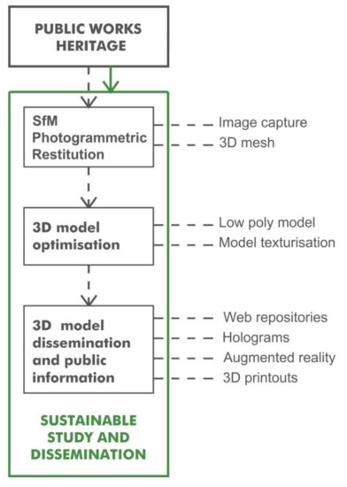 The approach adopted here proposes a procedure for the sustainable study and dissemination of the public works heritage (Figure 1). The first step, the drone-mediated aerial capture of a sizeable heritage asset, is followed by SfM (structure from motion) 3D digitisation, model optimisation for dissemination via online repositories, AR, holographic visualisation and 3D printouts of the model. The proposal is based in its entirety on the use of free software and low-cost tools.