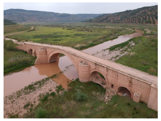 The steps set out in the methodology were followed in the case study described hereunder to illustrate some of the procedures involved and the problems posed. Ariza Bridge, sited at Úbeda, Spain, was chosen for the study as it was deemed representative of the country’s public works heritage. A sixteenth-century Renaissance stone arch bridge, it is one of the several long-span masonry bridges built in that period in northern Andalusia, a region in southern Spain. It features five barrel vaults, a 31 m central span and a double arch ring. Commissioned and paid for by the bishopric, it was built between 1550 and 1560 according to the records left by architect and master builder Andrés de Vandelvira, who also designed Jaén Cathedral. It spans the River Guadalimar on the road from Úbeda to La Carolina [74,75]. It was originally sloped with parapets and semi-circular piers downstream and triangular cutwaters. Repairs conducted in 1868 involved an unfortunate reconstruction of the cutwaters and downstream pier faces, however, while also lowering the (nonetheless still perceptible) hump-back. A second vault under one of the side vaults was added in the 1980s, offsetting the sideways thrust of the 5.6 m to 9.5 m wide piers to balance the structure [76].