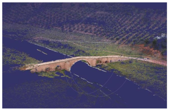 - Densification. Point clouds are a set of points containing dimensional, geometric, and colorimetric information. As the cloud delivered in step 1 is scattered, i.e., contains only the concurrent key points in the photo set, the object or scene is scantly recognisable. Densification yields a high-density, highly accurate point cloud, in this case for the bridge studied (Figure 3). The point cloud must be processed and discretised before generating the mesh to lower noise and delete non-valid points, which may generate undesired effects during subsequent mesh creation. Since Regard3D software does not feature editing tools, the point cloud must be exported to MeshLab [78], a free, open-source software that delivers a mesh based on the Regard3D-generated point cloud. The imported point cloud must then be cleansed of noise, atypical values and irrelevant points with tools furnished by MeshLab for point selection and elimination. The initial point cloud (outcome of the photogrammetric survey) generated here weighed 43.8 MB and comprised 1,703,874 points. For it to be usable, however, the scope of the work had to be delimited. As here it was defined to comprise the bridge and its closest surroundings, the cloud ultimately used contained 1,154,940 points and weighed 33.9 MB.