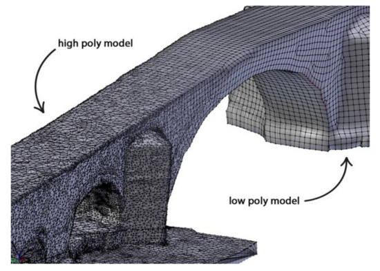 The ‘high poly’ (so called in allusion to the polygonal weight of the constituent mesh) or photogrammetric model of Ariza Bridge had to be reduced in a simple, two-stage process consisting of: (a) ‘low poly’ model generation and (b) model texturisation.