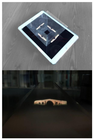 Professional 3D image projectors are presently available on the market, but scantly affordable. In contrast, simple, low-cost options are in place to build holographic viewers. The idea is to build a reflective pyramid, a fundamental element in holographic projection, with no need to use costly or special materials to create the optical effect of a 3D model that floats in thin air. The technique used is Gaussian optics on a reflective material [69]. The three stages involved in generating the end hologram are: building the holographic pyramid; editing the video to be projected; and viewing the hologram.