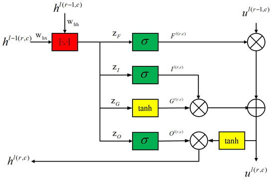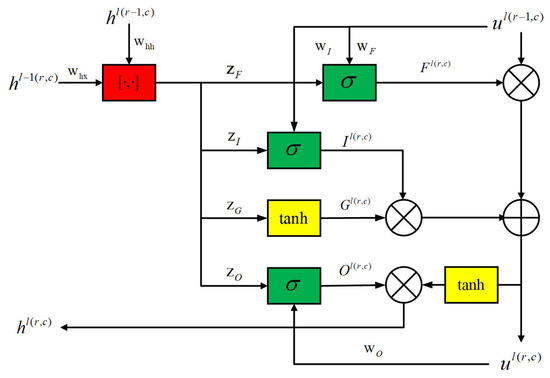 The specific logic gate unit structure of LSTM is shown in Figure 4. First, we take (the neuron at the same time step in the previously hidden layer outputs) and (the neuron at the previous time step in the current layer) as the input of the current layer, and we then carry out weight transformation and obtain the original output . Then, the original output is decomposed into four components, , , , , which are de-linearized through the activation function to obtain the four logic gate unit components of forget gate F, input gate I, quasi-cell state G, and output gate O, respectively. Finally, according to Equation (5), the forget gate F and the unit state of the previous time step are multiplied element-wise, and the input gate I and the quasi-cell state G are multiplied element-wise. The two parts of the product are added by element to obtain the unit state at the current time step; the unit state is activated, according to Equation (6), and element-wise multiplication is performed with the output gate O Product, in order to obtain the final neuron output at the current time step (time r) of the hidden layer (layer l).