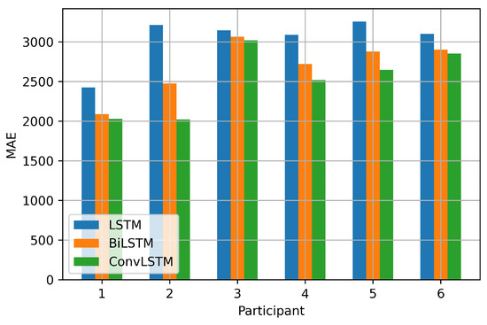 The MAE is used to compare the accuracies of different models. The smaller the value, the smaller the absolute error between the true value and the predicted value, and the higher the accuracy of the model prediction. It can be seen, from Figure 13, that the MAE values of the BiLSTM and ConvLSTM models were lower than those with the rest of the participant data sets training gains. In addition, the MAE value of the ConvLSTM model was lower than that value of the BiLSTM model under the same conditions. It can be seen that, when the data size was at least 424,875 (the size of participant 2’s data set), the prediction error can be significantly reduced by adding two-way time steps or convolutional layers to the traditional LSTM model. From the MAE value of the model trained using the six participant data sets, it can be seen that the performance of the convolutional layer in reducing the prediction error was better than the two-way time step.
