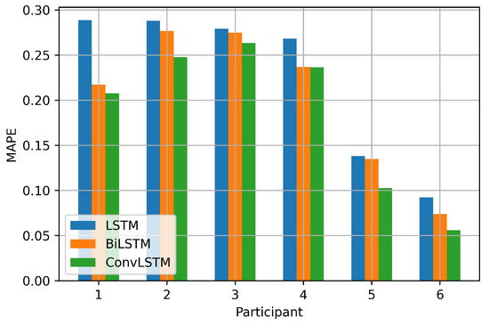 The MAPE is used to compare the stability of different prediction models. The smaller the value, the smaller the proportion of the absolute error square in the true value, the better the stability, and the smaller the fluctuation. It can be seen, from Figure 14, that the MAPE values of the model trained under the data sets of participants 1, 2, 3, and 4 were all higher than those of the models trained under the data set of participant No. 5, and the MAPE value of the model trained under the data set of all six participants. The data sets of participants 1–4 were at least 50% larger than the data sets of participants 5 or 6. It can be found that, when the data set is relatively large, the model predicts that the volatility will increase. In this case, the convolutional layer or the bidirectional time step can still weaken the change, to a certain extent, where the improved ability of the convolutional layer is higher than that of the bidirectional time step.