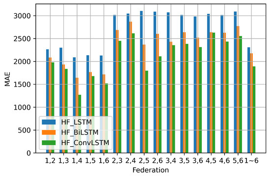 It can be seen, from Figure 16, that, under the conditions of the Horizontal Federated Learning system, whether the participants were paired for Federated Learning or all participants participated in Federated Learning at the same time, the prediction errors of the HF-BiLSTM model and the HF-ConvLSTM model were lower than those of the HF-LSTM model. After comparing with the experimental results in Figure 13, it was found that the MAE values of the model based on Horizontal Federated Learning conditions were all lower than the smallest value in the federated participant combination. It can be seen that the demand prediction method based on Horizontal Federated Learning can significantly reduce the prediction error of the model, compared with the prediction error of the model obtained by independent training.