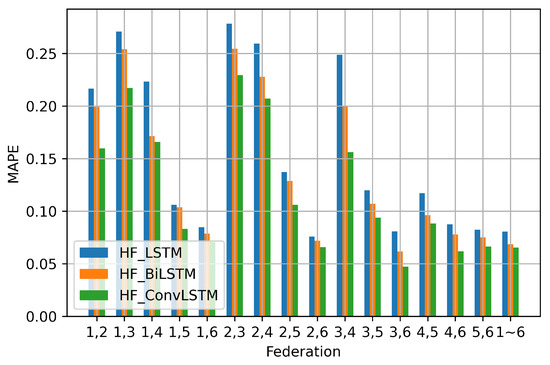 It can be seen, from Figure 17, that, under the conditions of the Horizontal Federated Learning system, whether the participants were paired for Federated Learning or all participants participated in Federated Learning at the same time, the prediction error fluctuations of the HF-BiLSTM model and the HF-ConvLSTM model were lower than that of the HF-LSTM model. By comparison with the experimental results in Figure 14, it can be seen that the MAPE values of the models based on the Horizontal Federated Learning condition were lower than the smallest value in the combination of federated participants. Thus, the demand forecasting method based on Horizontal Federated Learning can significantly reduce the forecast error of the model.