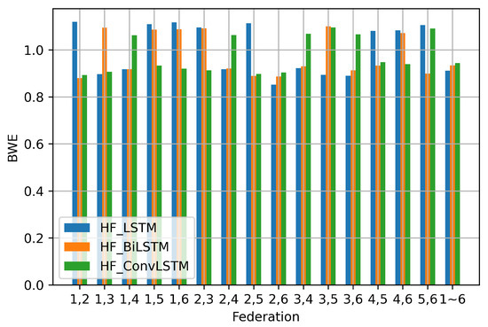 Figure 13, Figure 14 and Figure 15 show the three evaluation indicators of MAE, MAPE, and BWE, respectively, in order to examine the predictive ability of the model under the condition of non-Federated Learning system. Figure 16, Figure 17 and Figure 18 also show the MAE, MAPE, and BWE indicators, respectively, when examining the predictive ability of the models, considering the Horizontal Federated Learning system.