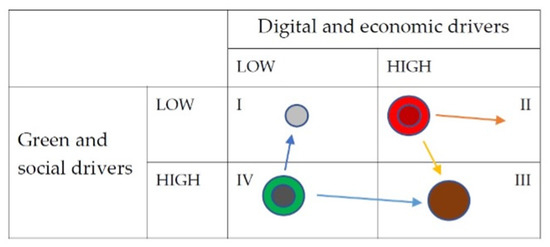 Recalling Table 1 above, the four boxes of the left column suggest the possibility of a couple of partial I4.0+ transition paths with different starting points and directions of evolution. We identify four possible paths by combining low to high levels of digital and economic drivers with low to high levels of green and social drivers. Figure 1 represents the transition opportunities of LPSs to I4.0+, starting from four possible initial states.