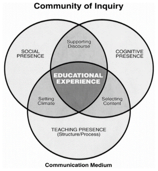 - Garrison, R.; Anderson, T.; Archer, W. Critical Inquiry in a Text-Based Environment: Computer Conferencing in Higher Education. Internet High. Educ. 2000, 2, 87–105. [Google Scholar] [CrossRef] [Green Version]