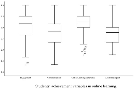 Box plot for graduate students’ Engagement, ease of Communication, online and distance learning Experience, and academic Achievement.
