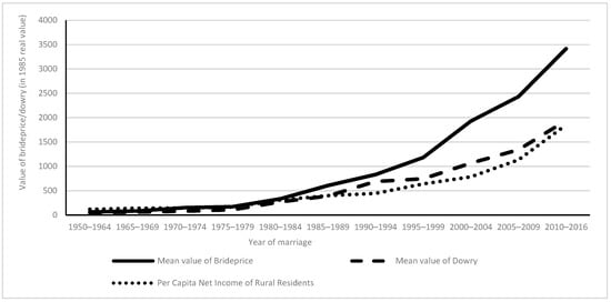 Brideprice/dowry is increasingly attracting the attention of scholars and policymakers because of its pervasive prevalence in developing countries and the significant property transfers and bargaining it entails [1,2]. They can be several times larger than the annual income of rural households, which can be substantial enough to affect the welfare of women and a society’s distribution of wealth [3,4,5,6,7,8]. Thus, China’s No. 1 Central Document in recent years explicitly states that excessive brideprice has an adverse effect on a healthy social environment due to its huge economic burden imposed on rural households. The high brideprice makes the phenomenon of “poverty due to marriage” occur in rural China frequently, which is also one of the most important reasons for the decline of the marriage rate in China. This poses great challenges to the sustainable development of Chinese society and the rational change of population structure.