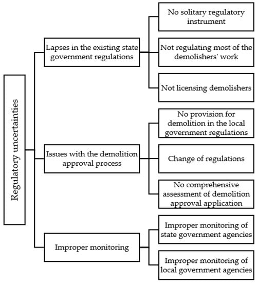 In SA, both state and local government agencies are engaged in regulating the RLSC of DW. However, as shown in Figure 1, common themes across the interviews are the ‘lapses in existing state government regulations’, ‘issues with the demolition approval process’, and ‘improper monitoring’, which lead to regulatory uncertainties for QA in the RLSC of DW. Each of these themes will be discussed in the following sections.