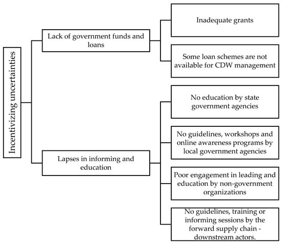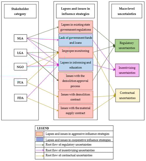 The external stakeholders’ influence strategies generate and provide useful information for the internal stakeholders in the RLSC of DW. Wijewickrama et al. [17] found that the government, as the most influential external stakeholder, provides useful information to the internal stakeholders in a RLSC by employing three strategies: regulating, subsidizing, and leading. The authors further clarified that the external professional communities provide information to the internal stakeholders via standardizing, educating, informing, and leading. Wijewickrama et al. [63] accentuated the importance of the information provided by external stakeholders as they become the base for internal stakeholders to process most of their in-house information. However, the RLSC in the construction industry has not benefited from a well-structured information flow [5]. It has been found that the entire supply chain is deficient in useful information needed for decision making, resulting in fragmentation and many uncertainties [64]. Since the external stakeholders’ influence is the main source of information in a RLSC, the ineffective external stakeholders’ influence strategies could be a persuasive cause for information deficiency in the RLSC of DW. Therefore, the external stakeholders’ influence strategies and absence of useful information (i.e., uncertainties) in the supply chain could be dependable and related.