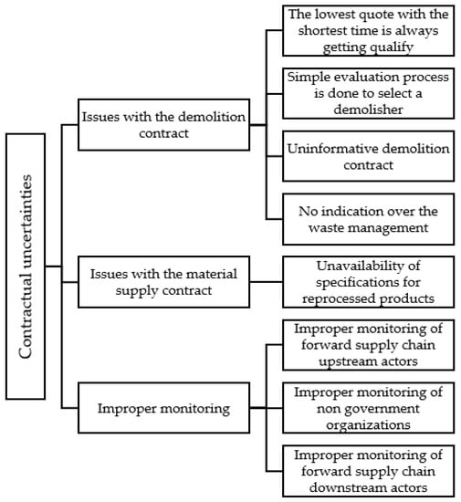The internal stakeholders of the RLSC of DW are connected with the forward supply chain actors at two points. First, when a facility is about to be demolished, the builder or client (i.e., upstream actors) employ a demolisher to undertake work. Second, after producing re-processed products, the waste processors connect with potential customers (i.e., downstream actors) interested in using the re-processed products. These upstream and downstream actors influence the demolishers and waste processors, respectively, through forming contracts. Even though forming contracts is an information-centric influence strategy, it has issues, as discussed below, which lead to contractual uncertainties. A summary of these findings is illustrated in Figure 3.