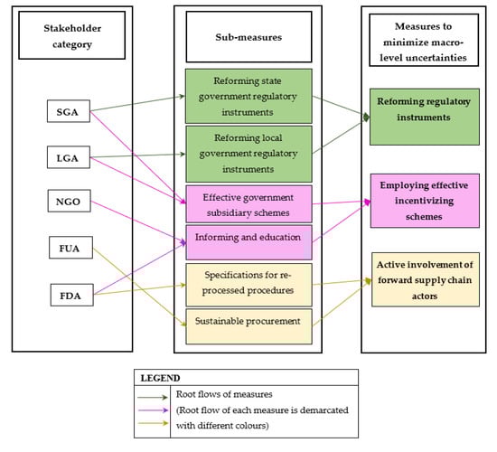 The following are three measures that the external stakeholders could employ to minimize the macro-level uncertainties arising from their influence strategies as discussed: (1) reforming regulatory instruments, (2) employing effective incentivizing schemes, and (3) active involvement of forward supply chain actors.