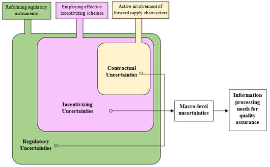 However, ineffective external stakeholders’ influences prevent successful RL adoption. Govindan and Bouzon [20] found that a lack of legislation or inappropriate laws is a major global barrier to waste management. The authors further asserted that lack of support and poor coordination from customers hinders the RL implementation. When the external stakeholders’ influence strategies are not effectively implemented, the useful information needed for the RL implementation is not made available to internal stakeholders. According to the Organizational Information Processing Theory (OIPT), lack of useful information creates ‘uncertainties’ that will lead to information processing needs (IPNs), to which the organization must respond effectively to meet the expected performance [21,22]. The uncertainties that arise from external factors outside the supply chain, which are not within the direct span of control of the organizations in the supply chain, are defined as ‘macro-level uncertainties’ [23,24,25]. An organization needs to identify uncertainties at a macro-level because not having them identified has an adverse impact on organizational performance [24,25]. Given this, the current study argues that internal stakeholders in the RLSCs encounter macro-level uncertainties due to ineffective information-centric influencing strategies employed by external stakeholders. These macro-level uncertainties create IPNs for internal stakeholders to respond appropriately [26]; otherwise, they would not perform QA effectively and efficiently. Therefore, investigating the macro-level uncertainties for QA in the RLSCs, becomes relevant and timely.
