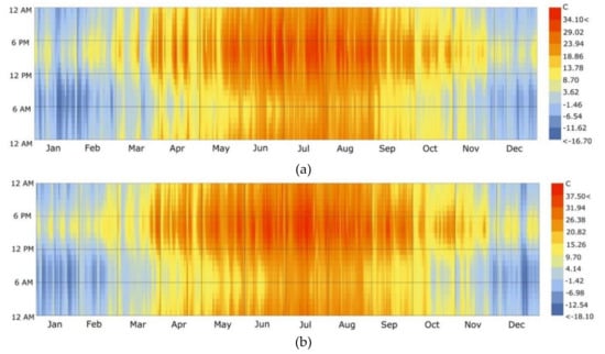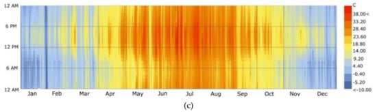Annual hourly temperature of the typical cities in each gully region. (a) Ping Lang (Gully region of Long Dong). (b) Yan’an (Gully region of Shan Bei). (c) Bao Ji (Gully regions of Wei Bei).
