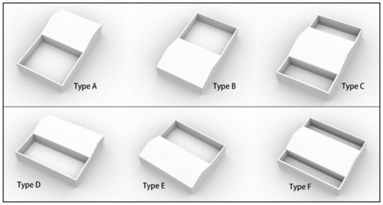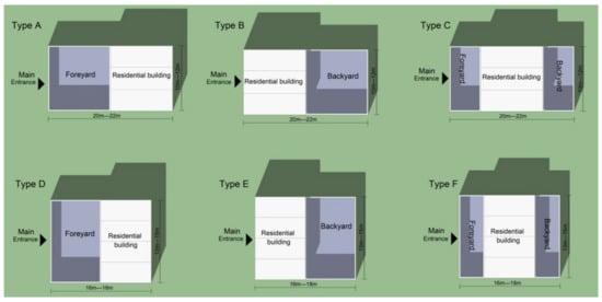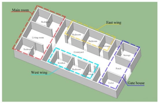 According to the classification of different dwellings, a simplified model of each typical dwelling can be depicted as shown in Figure 15. By combining Figure 15 (diagram of vernacular dwellings types) with the field investigation, simplified models of the six different types vernacular dwellings were made, which cover an area of 240 m2. For three bays, Type A, Type B, and Type C, the length is 20 m and the width is 12 m. For four bays, Type D, the length is 16 m and the width is 15 m. Both the courtyard and main residential building are 120 m2. The main residential building is a brick and concrete structure, and the height is 4.5 m. The ground material in the courtyard is concrete, and the courtyard wall is a 2.7 m brick wall.