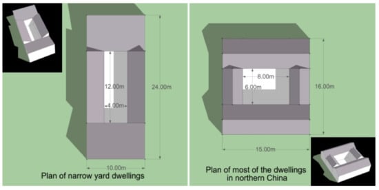 Since ancient times, the Loess Plateau has been a place with the contradiction of high population density and limited cultivable land. For this reason, construction methods were developed to reduce construction land and maximize cultivable land. Courtyard dwellings on the Loess Plateau are usually called narrow yard dwellings, and the most unique point is the proportion of the courtyard. The length–width ratio of narrow yard dwellings is close to 3:1 [37]. This is different from most dwellings in northern China, the proportion of which is around 1:1, Figure 8.