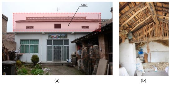 Attic space in typical vernacular dwellings. (a) Outside appearance of an attic. (b) Inside an attic.