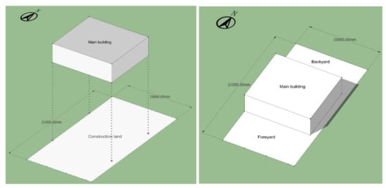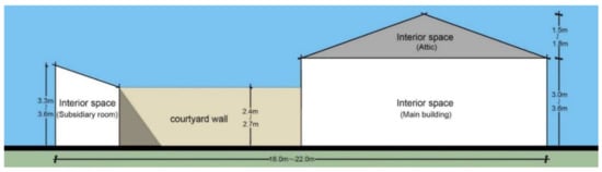 In this context, in order to carry out the further research on current newly built vernacular dwellings, we conducted a number of field investigations. In the new countryside constructions, the cover areas are from 200 m2 (0.30 mu) to 267 m2 (0.40 mu); the height of main building is usually 4.5 m to 5.4 m; subsidiary rooms are 3.3 m to 3.6 m; and courtyard walls are 2.4 m to 2.7 m, as shown in Figure 14.
