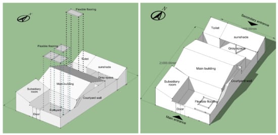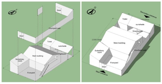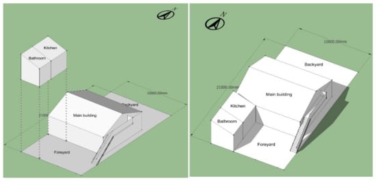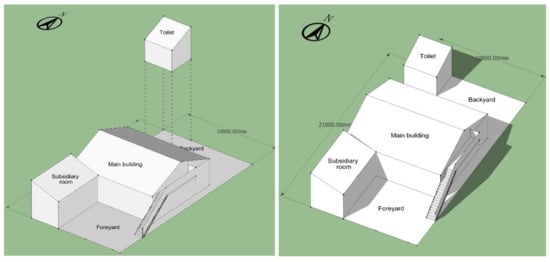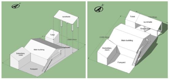 The sunshade space is suggested to be planned in the north part of the backyard, connected to the toilet, as shown in Figure 19. In this way, the backyard can be tidier, and the usage efficiency can be improved. Moreover, the wall can be shared by the sunshade space and toilet to prevent the cold northwest wind entering the courtyard, as shown in Figure 24.