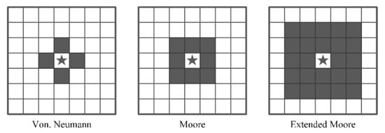 In the light of neighbor structures, cellular neighbors are divided into three forms, such as Von. Neumann neighborhood, Moore neighborhood and extended Moore neighborhood in Figure 1.