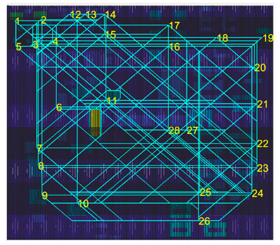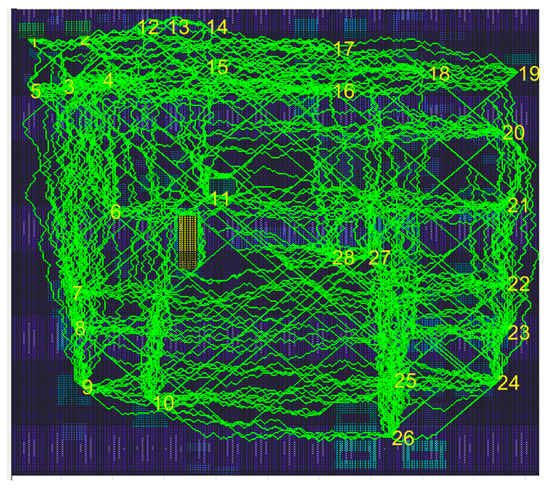 In this case, the 28 waypoints in the region constituted 378 origin-destination (OD) pairs. The route set was established according to the optimal routes which found by the improved CA among all OD pairs. As shown in Figure 6, the optimal spanning tree algorithm was used to select 30 routes from it to build the distribution network, and the routes of the UAV directly returning to each supply center after completing the distribution task at the demand point constituted the return route network. Therefore, the double layer air route network was composed of logistics route network and direct return route, which is shown in Figure 7.