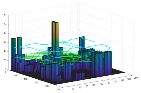 According to the above descriptions, simulation was conducted. The contrasts of air route between improved CA and traditional CA can be seen in Table 3, Figure 4 and Figure 5, comprehensive factors of the air route network based on improved algorithm are shown in Table 4. Based on the improved CA algorithm, the route could effectively avoid obstacles and reduced the risk degree, especially in the area with dense obstacles, which effectively guarantees the flight safety. From the perspective of configuration, it was apparent that the route was relatively straight compared with the route solved by traditional CA, which decreased unnecessary turns and enabled the UAV to operate more quickly. The average distance of single route was 20% less than the traditional CA so that the flight time per route decreased by 18.2 s. Furthermore, through orientation of cellular step values and localization of cost, the improved algorithm was more intelligent in the search process. The average single path search time was only 3.5 s, which was 1.2 s quicker than that of the traditional search time.