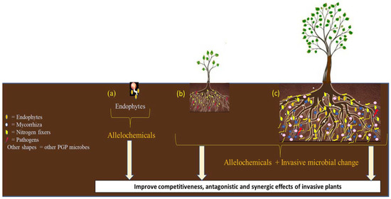 However, the effects of secondary metabolites of endophytes varied greatly between invasive and native plants, and the endophytes of invasive species may be host-specific to facilitate plant invasion [83]. In general, invasive plants could benefit from association with endophytes to improve their competitiveness and sustain their invasiveness in two ways: (i) abundance of endophytes, such as mycorrhiza and PGP microbes, may improve plant growth, and the establishment and consequently the invasion of new areas [84,85], and (ii) they use endophytes as novel weapons to produce novel allelopathic compounds to inhibit the native species [60,86,87], and hence dominate in the new plant community. More explanations and examples are presented in Figure 2.