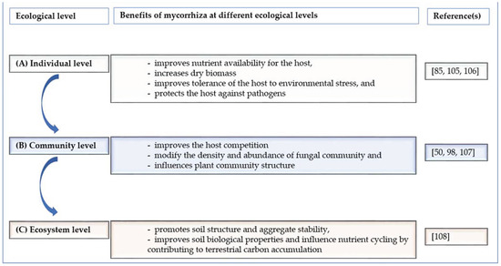 In low-resource arid environments, invasive plants tend to form associations with rhizobia and mycorrhizal fungi to obtain enough N and P to survive, improve establishment, and tolerate adverse conditions [101,102]. Mycorrhizal symbioses, through extensive hyphal networks in soil, protect invasive plant communities against environmental stresses, pathogens, nutrient deficiency, salinity stress, drought, and soil disturbance [93,98,100,103,104]. Generally, the numerous advantages of mycorrhizal–plant symbiosis could be sub-grouped at the levels of (a) individual mycorrhizal–plant, (b) community, and (c) the ecosystem (Figure 3).