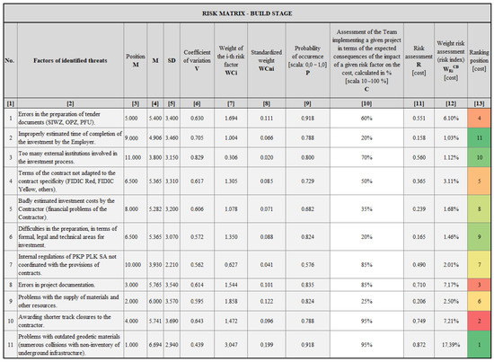 To facilitate the application of the computations, we developed a special calculation sheet in Excel, in which user-defined data calculates the percentage index of weighting for individual risk factors and the costs of individual stages of work. The results we obtained are strictly dependent on defined threats and the assessment of their occurrence and the effects on the analyzed project. A comprehensive description of the tool will be presented in subsequent publications.