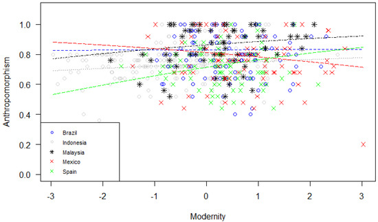 p = 0.046). In particular, modernization predicted an increase in anthropomorphism in all countries, except for Latin American countries (i.e., Brazil, where it had no effect on anthropomorphism, and Mexico, where higher modernization was linked to lower anthropomorphism). Moreover, modern pet–ownership dynamics (