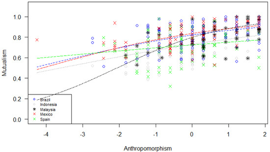 p< 0.001). In particular, higher anthropomorphism predicted higher mutualism across all countries, especially in Malaysia (see