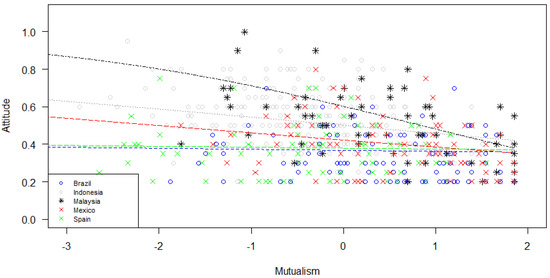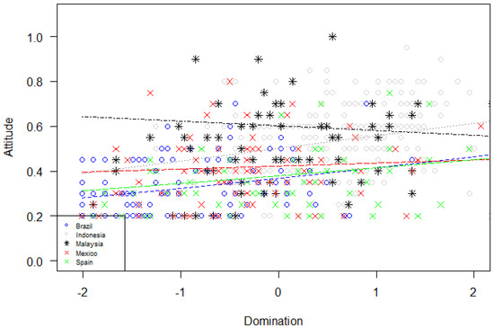 Figure 4). In particular, higher domination predicted worse attitude in all countries, except in Malaysia, while higher mutualism predicted better attitude in all countries, especially in Malaysia.