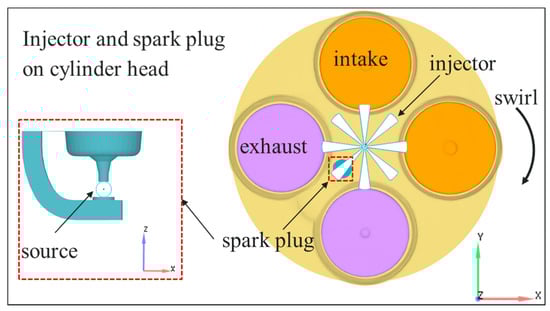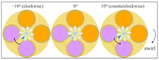 First, the injector clocking angle was varied from −20 to 20°, where the negative sign denoted clockwise rotation and the positive number represented counterclockwise rotation, as shown in Figure 3. It is also worth mentioning that the swirl motion followed a clockwise direction. Note that the baseline injector clocking angle was 0°.