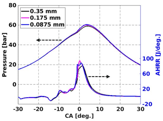 A mesh refinement study with three different minimum mesh sizes (0.35 mm, 0.175 mm, and 0.0875 mm) surrounding the spark plug was performed. Simulations with minimum mesh sizes were performed using two to four levels of refinement near the spark plug-embedded region. For the sake of brevity, Figure 2 depicts only the in-cylinder pressure and apparent heat release rate (AHRR) results obtained for the different mesh resolutions. Finally, considering the mesh convergence and computational demands, the 0.175 mm mesh size was selected as the reference minimum mesh size for the remainder of the study. Note that CFD model validation against engine experimental results during cold idle has been performed in Zhao et al. [,].