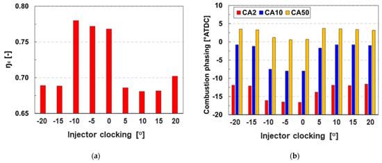 Effect of injector clocking on (a) combustion efficiency (ŋc) and (b) combustion phasing (CA2, CA10, and CA50).