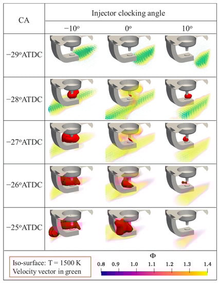 Flame kernel development, equivalence ratio (Φ) distribution, and velocity flow field of three different injector clocking angles (−10, 0, and 10°) at different crank angles (−29 to −25°ATDC).