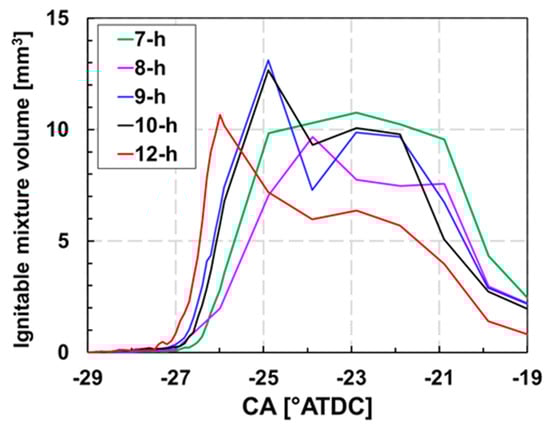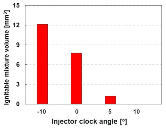 In a previous study [], an ignitable mixture volume, formulated on the cylinder charge volume of a temperature ranging from 1000 to 1500 K and a Φ ranging from 0.8 to 1.4, was introduced to characterize the early flame development and signify the mixture that was favorable for ignition. Figure 6 shows the ignitable mixture volume at different injector clocking cases at 5°CA after spark timing. Aligned with observations in Figure 5, the −10° clocking angle clearly had the largest ignitable mixture volume because of the sustainable flame kernel, while a lower ignitable mixture volume was shown in the 5 and 10° cases due to the suppressed flame kernel. This resulted in the unfavorable early ignition near spark gap and late main combustion in the 5 and 10° injector clocking cases, in turn producing the lower combustion efficiencies.