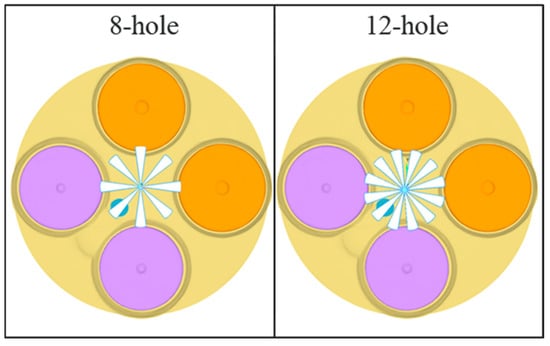 The effect of the number of nozzle holes on flame kernel growth and combustion performance was evaluated by varying it from 7 to 12 holes. Figure 7 displays a sample layout of 8- and 12-hole nozzles. For the different number of nozzle holes, the total nozzle area and total injected mass remained the same. Therefore, as the number of nozzle holes increased, the nozzle diameter decreased and the injected mass from each nozzle hole also decreased. Note that the baseline number of nozzle holes was 8.