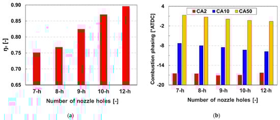 Effect of number of nozzle holes on (a) combustion efficiency (ŋc) and (b) combustion phasing (CA2, CA10, and CA50).