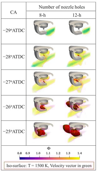 Flame kernel development, equivalence ratio (Φ) distribution, and velocity flow field of different numbers of nozzle holes (8- and 12-hole) at different crank angles (−29 to −25°ATDC).