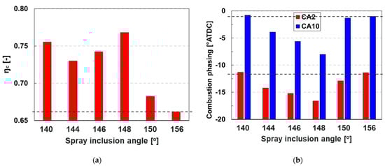 Effect of spray inclusion angle on (a) combustion efficiency (ŋc) and (b) combustion phasing (CA2 and CA10).