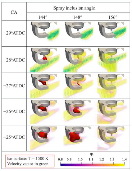 Flame kernel development, equivalence ratio (Φ) distribution, and velocity flow field of different spray inclusion angles (140 to 156°) at different crank angles (−29 to −25°ATDC).