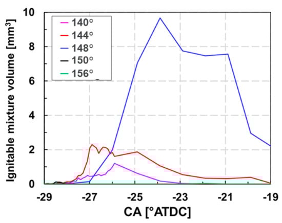 Figure 13 shows the effect of spray inclusion angle on the ignitable mixture volume at early ignition stage. When the spray inclusion angle was below 148°, the flame volume sustained for a short time but dropped down to zero afterward. The ignitable mixture volume in the 148° case was higher than those for other cases. This was consistent with the findings described in Figure 12. Early combustion hardly happened in the 150 and 156° cases and the ignitable mixture volume was almost zero.