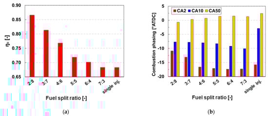 Effect of fuel split ratio on (a) combustion efficiency (ŋc) and (b) combustion phasing (CA2, CA10, and CA50).