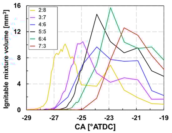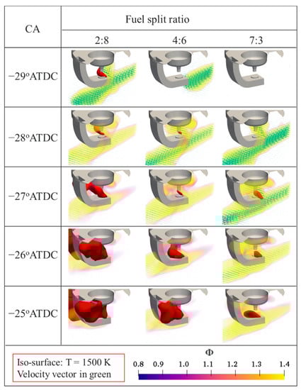 Figure 15 shows three split ratios selected to illustrate the influence of fuel split ratio on flame kernel development and equivalence ratio distribution. It was clear that the flame kernel formation and flame propagation occurred in all three cases. Figure 16 shows that the split ratio of 2:8 had the earliest rise in ignitable mixture volume.